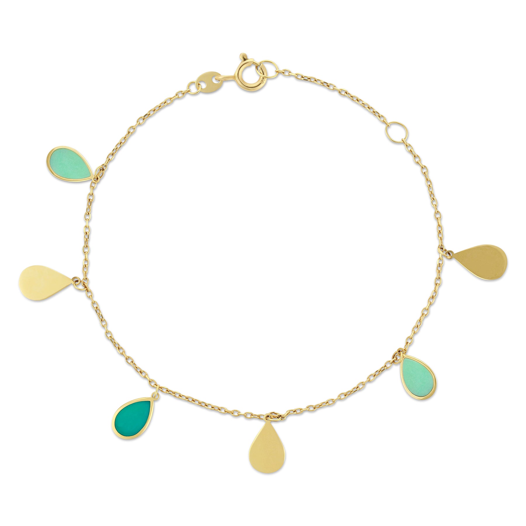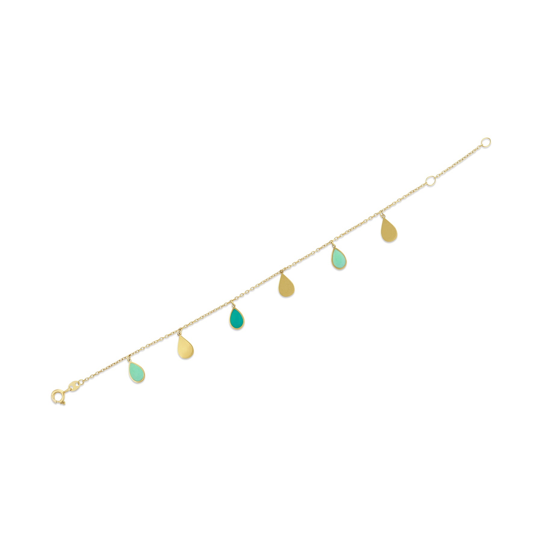 Light, playful, and effortlessly elegant, the Turquoise Drops Enamel Bracelet is crafted in solid 18k gold and designed to bring a soft splash of color to your everyday look. Delicate gold chains hold enamel teardrop charms in fresh turquoise tones, creating gentle movement and a luminous contrast against warm gold.