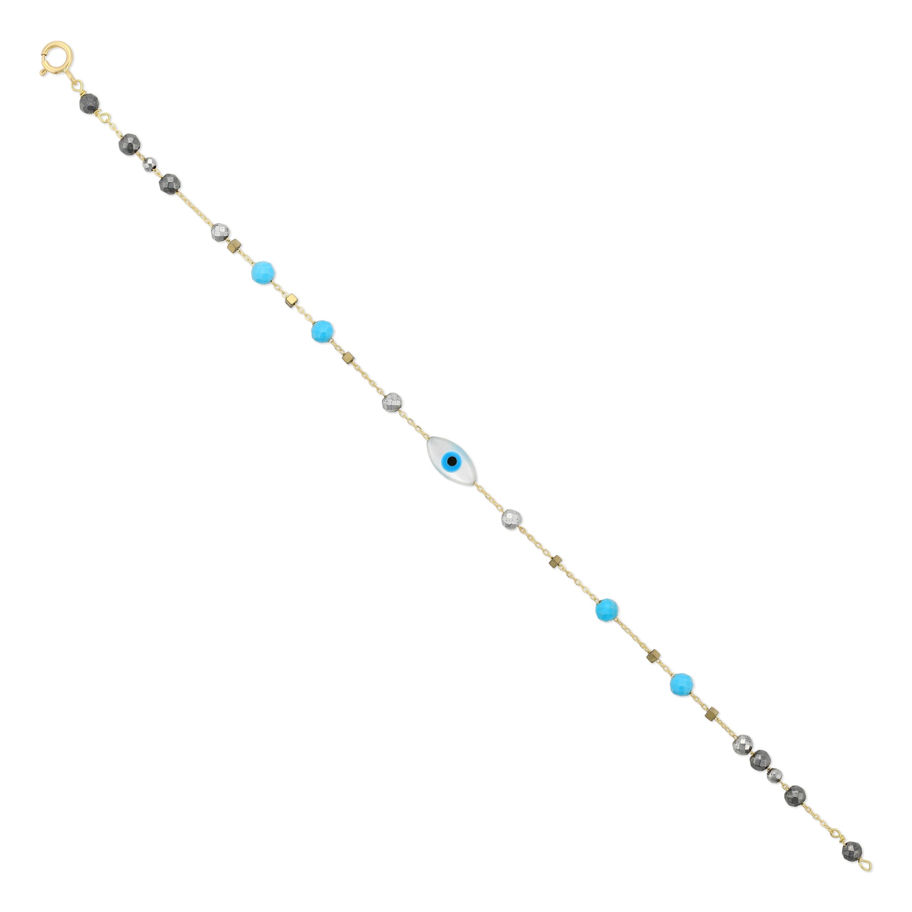 The Eye Charm Bracelet is crafted in solid 18k gold and features a refined combination of turquoise stones, faceted hematite beads, and a central eye charm. Designed to symbolize protection, balance, and positive energy, this bracelet blends meaningful symbolism with a modern, understated aesthetic. Elegant yet distinctive, it is made to be worn daily as a quiet talisman and a timeless finishing touch.