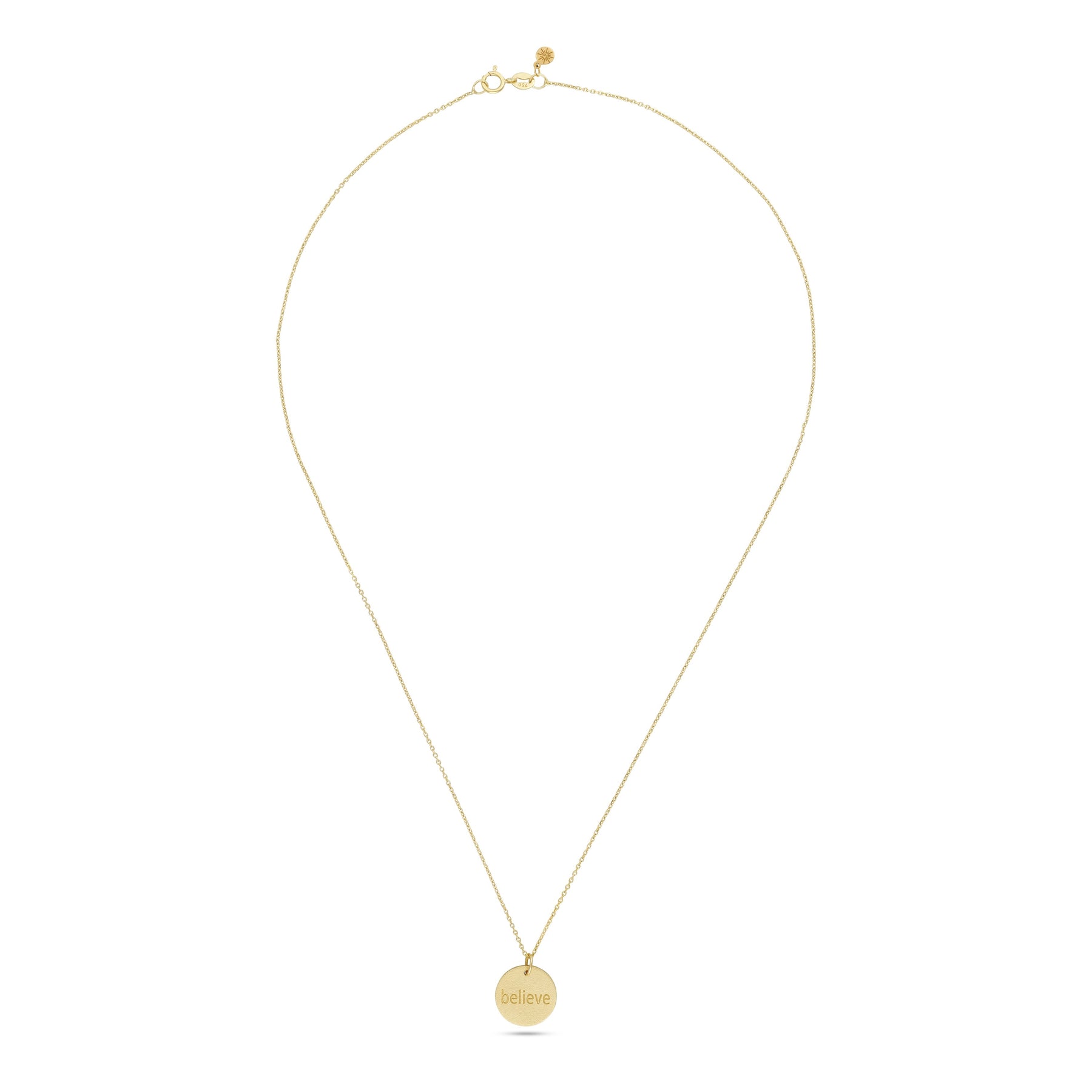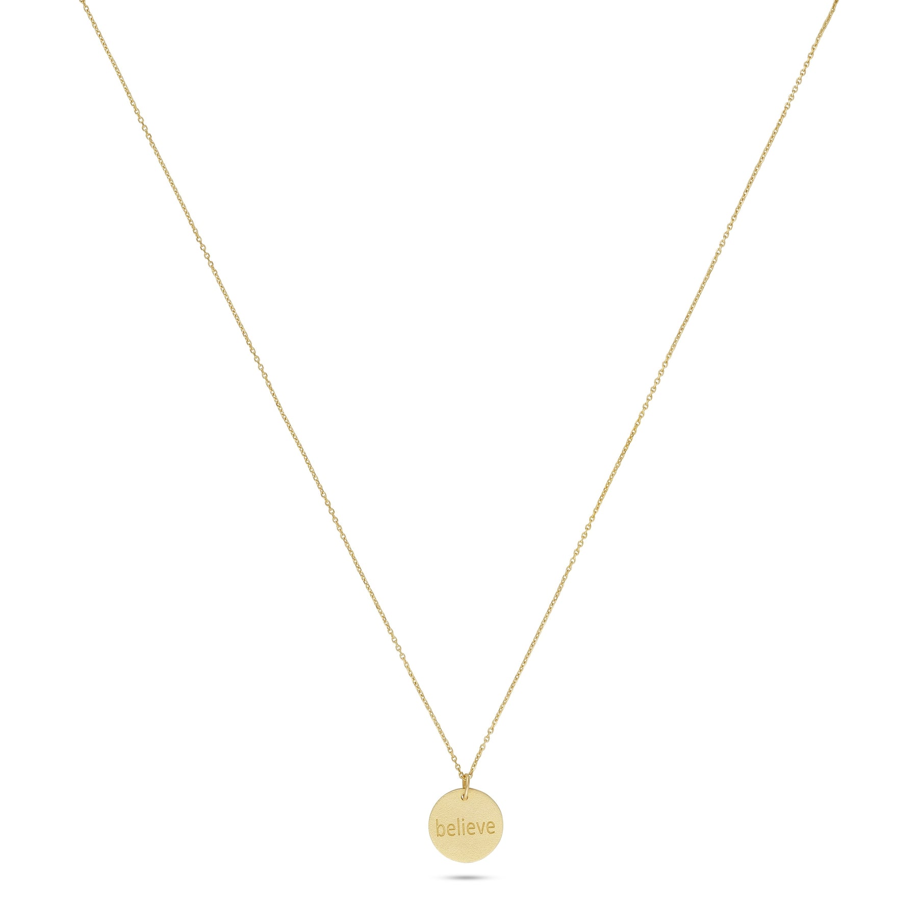 A gleaming 18kt gold circle pendant bears the inspiring word 'Believe,' suspended gracefully from a matching chain. This elegant piece is not just jewelry; it's a daily affirmation, a reminder to believe in yourself and the magic of your journey. Carry the essence of belief with you wherever you go.