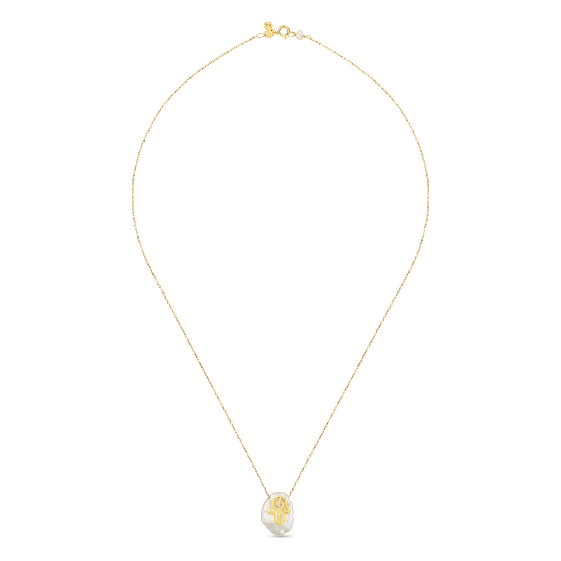 Design: gold Hamsa hand motif set on a pearl pendant