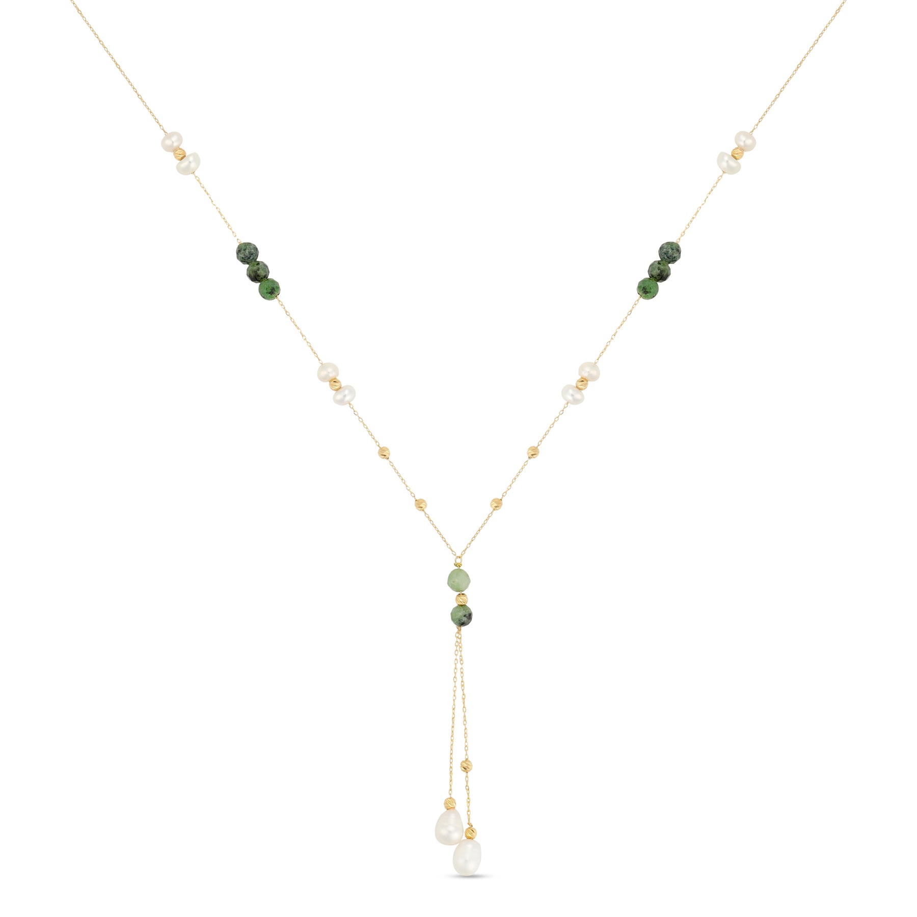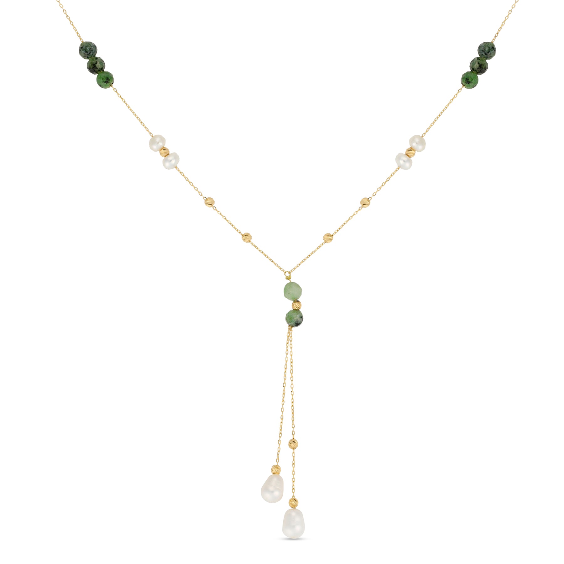 18k gold pearl and malachite lariat necklace for women, fine jewelry drop necklace