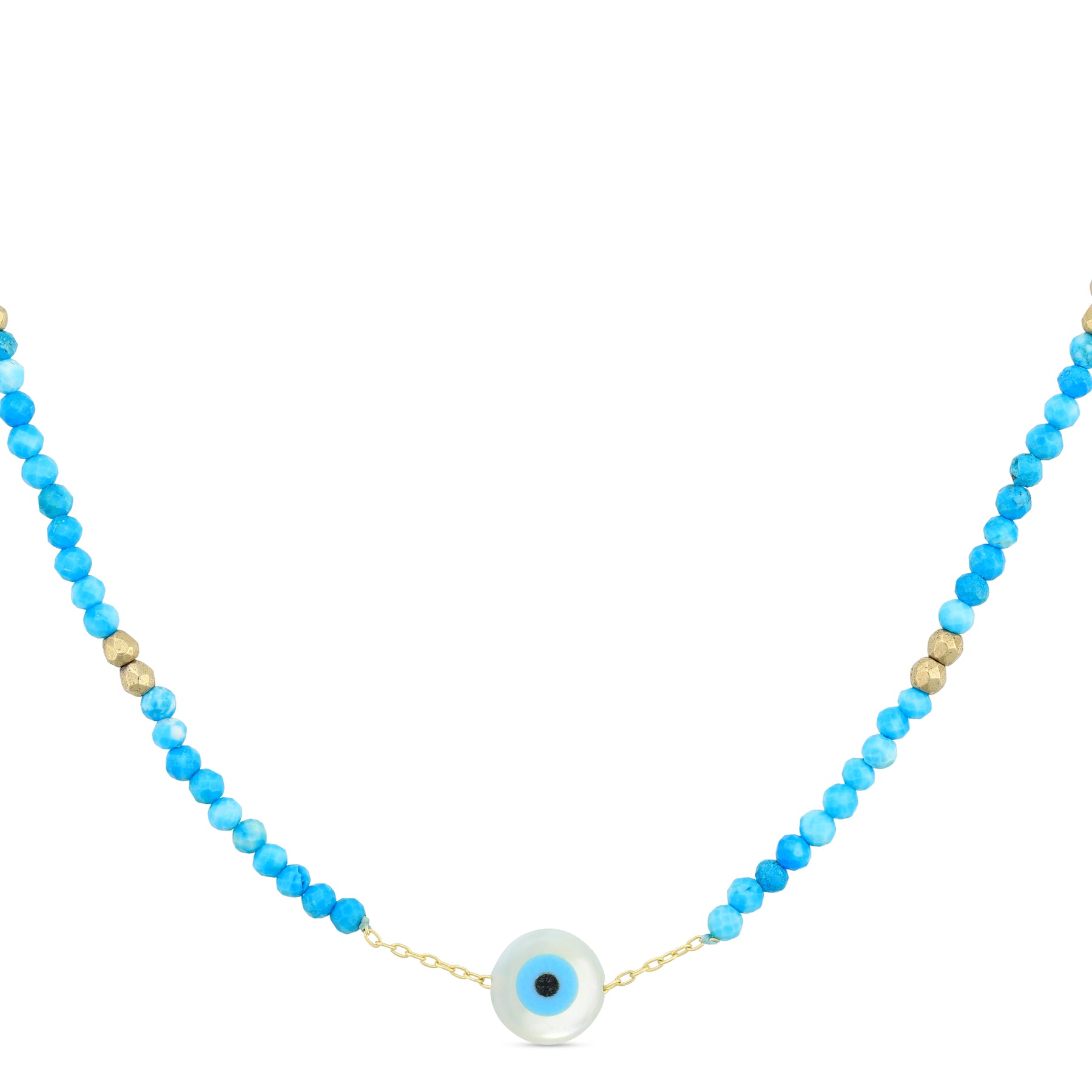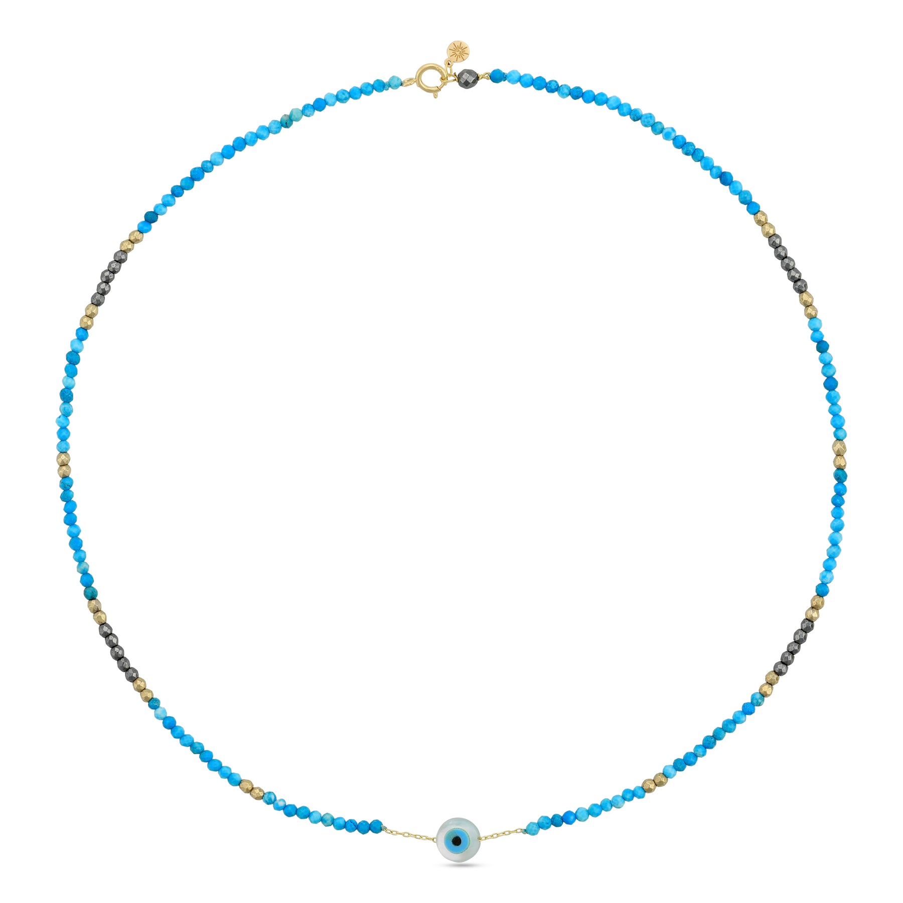 The Protective Eye Turquoise & Hematite Necklace is crafted in solid 18k gold and features a refined mix of faceted turquoise beads and hematite semi-precious stones along a delicate gold chain. Finished with a subtle protective eye charm, this necklace blends meaningful symbolism with a clean, modern aesthetic. Balanced and expressive, it is designed to be worn daily as a quiet talisman and an effortless finishing touch.
