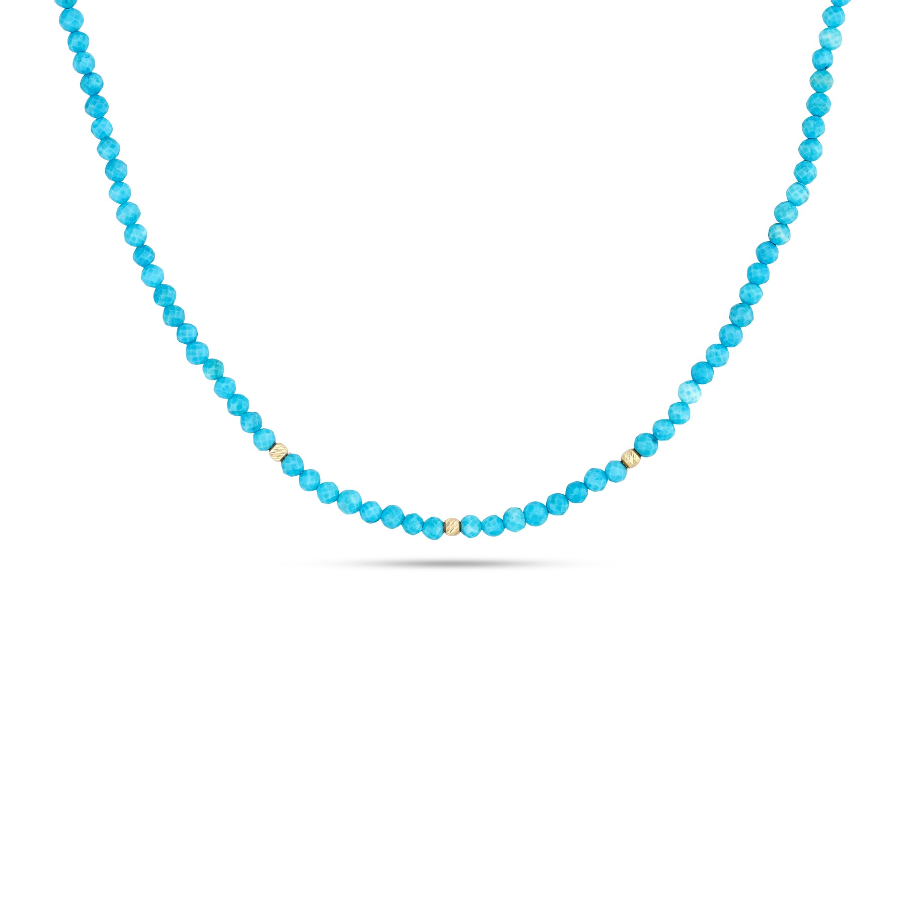 A delicate strand of faceted natural turquoise beads finished with an 18k gold clasp and three subtle gold bead accents. This timeless piece brings a fresh pop of color while keeping a refined, minimalist feel. Effortless on its own and beautiful for layering, it’s designed to be worn every day or styled for summer evenings.