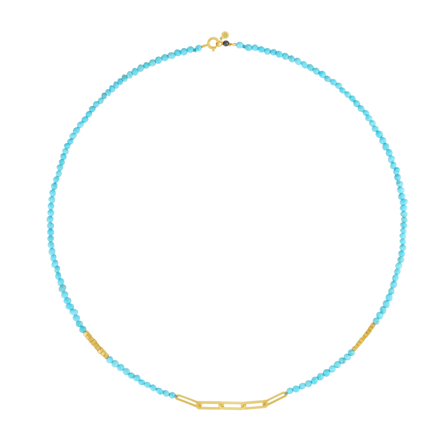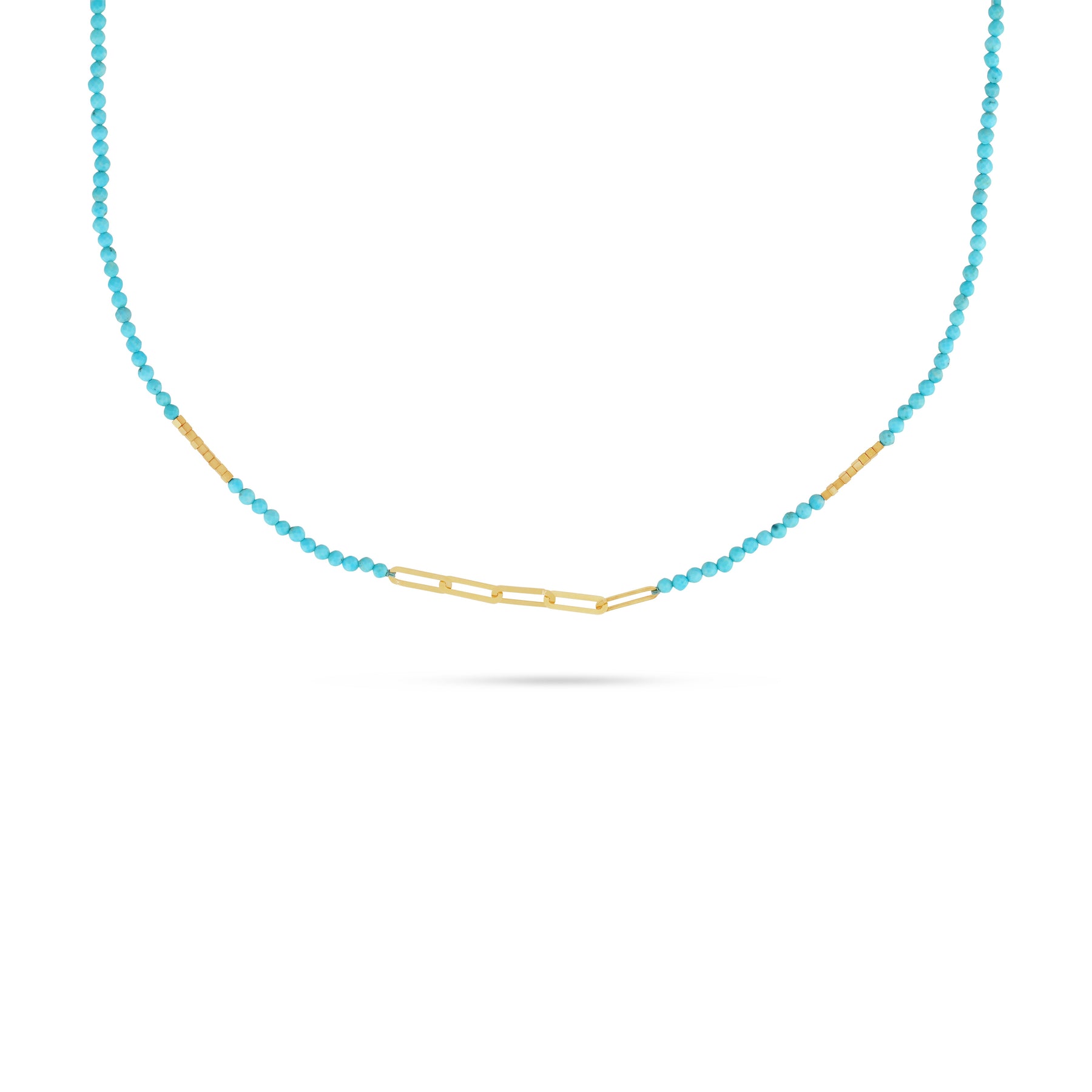 The Turquoise Link Necklace is crafted in solid 18k gold and features a strand of delicate turquoise beads accented with a modern gold link detail at the center. Blending natural color with clean geometry, this piece brings a fresh, contemporary touch to fine jewelry while remaining effortlessly timeless. Perfect worn alone for a subtle statement or layered for a more styled look.